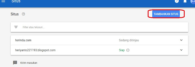 masuk ke adsense kita plih menu situs dan klik menu tambahkan situs
